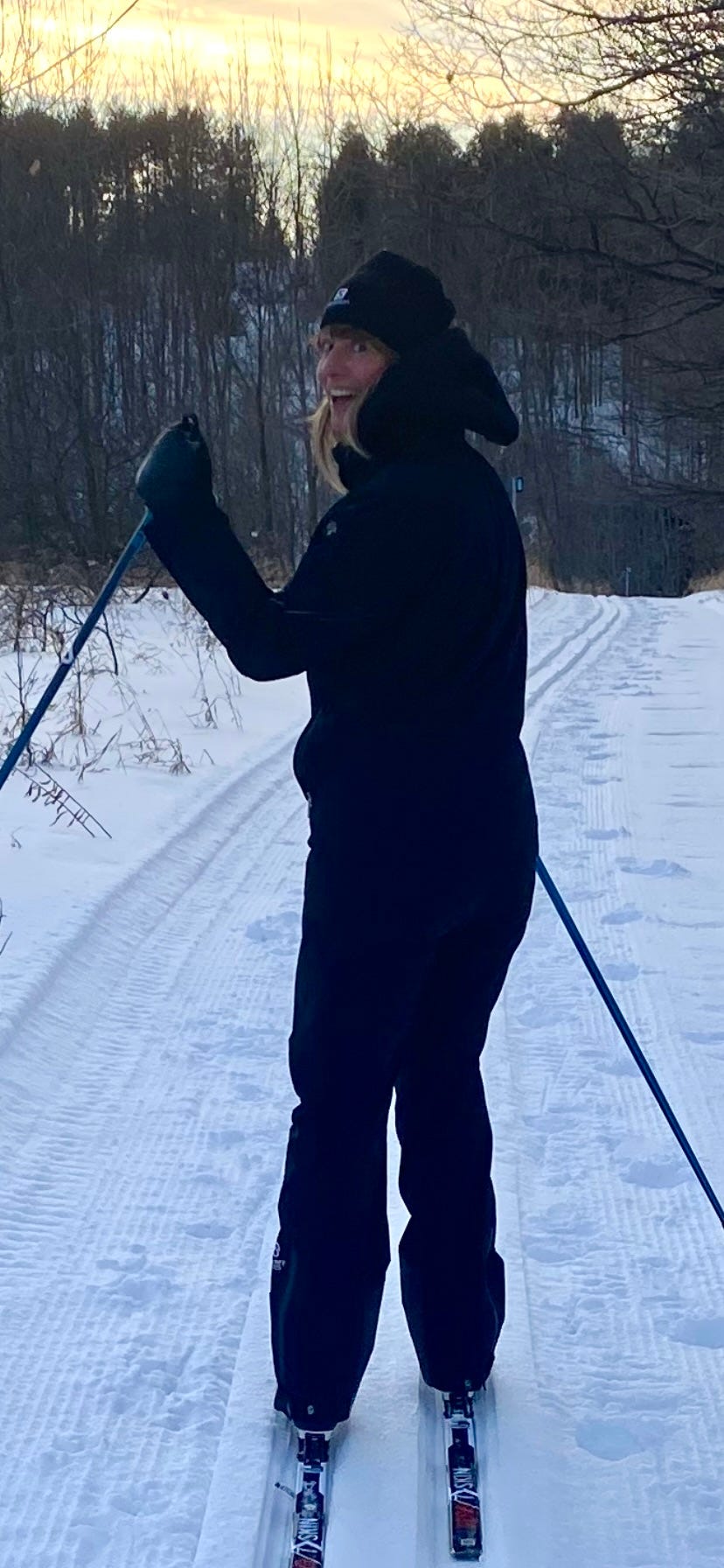 We’re lucky to have some beautifully groomed trails not far from us, kept up by someone who simply loves doing this and lets people ski there for free. Everything eased. My shoulders dropped. The noise inside my body quieted. Hours of what felt like flying, locked into machine-set parallel grooves. Nothing catching. Nothing asking for correction.